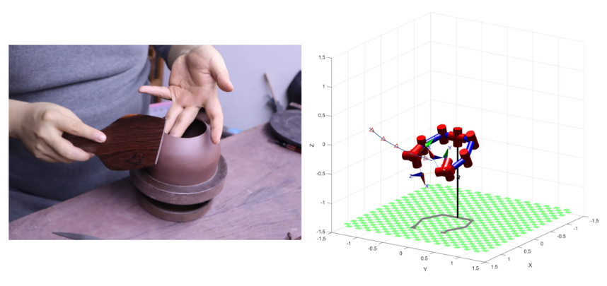 机械人采用UR5机械臂,并通过逆活动学算法计较关节角度。研究团队正在笛卡尔空间中进行轨迹规划,模仿陶艺师拍打壶身的动做。左机械臂担任固定陶坯内壁,通过动态调整速度和力度,确保陶坯受力平均,避免变形或开裂。尝试数据显示,机械臂正在接近陶坯时减速以精度,拍打完成后快速撤回,实现了高效且温和的协同操做。